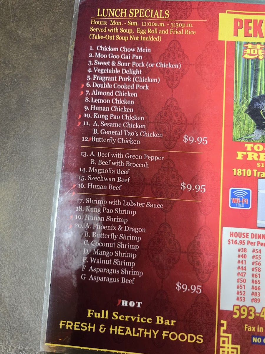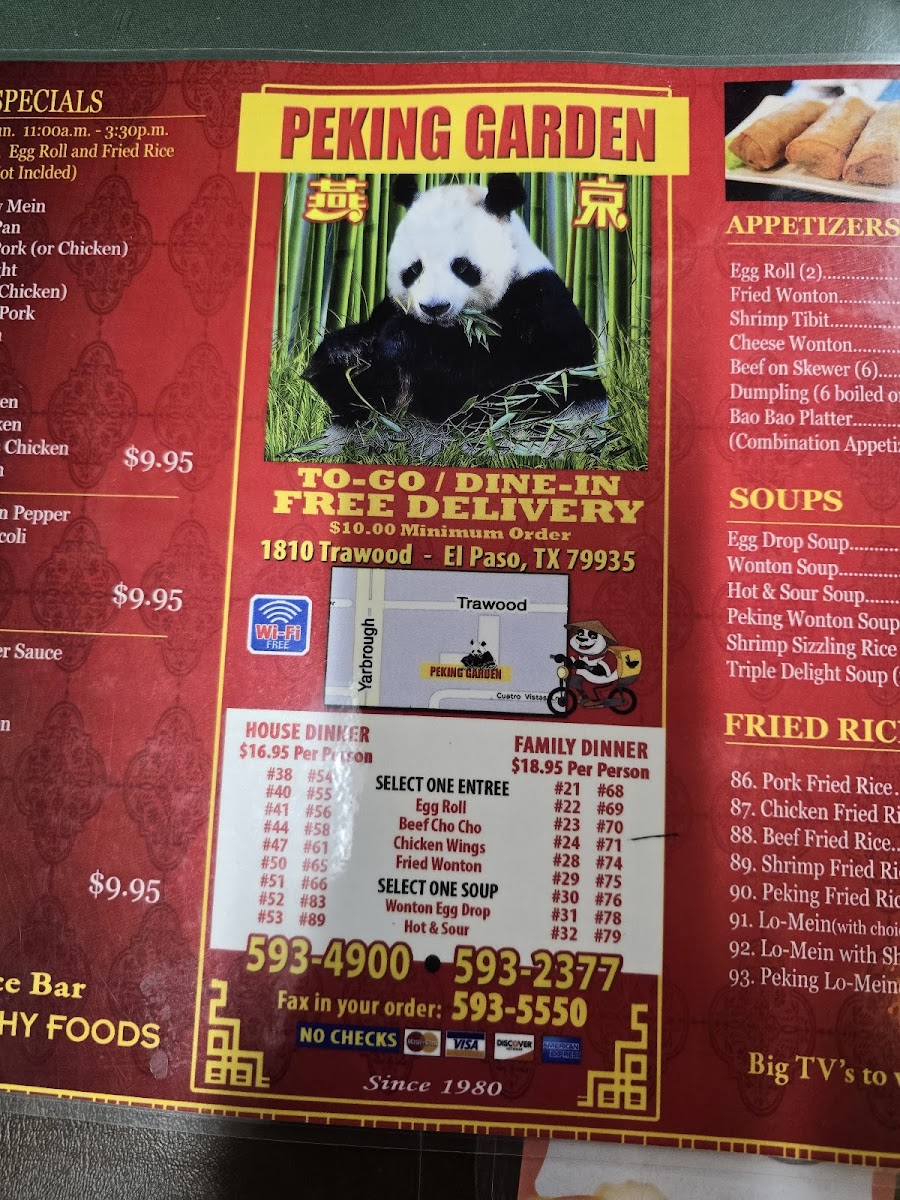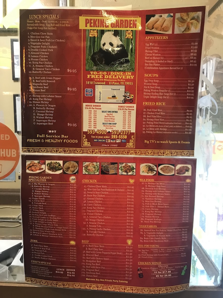 Welcome to Peking Garden, a cherished gem nestled in El Paso, TX, where nostalgia meets delicious dining. The menu is a delightful journey, inviting guests to explore nearly 100 authentic Chinese offerings, showcasing everything from traditional favorites to lunch specials that promise both value and flavor.